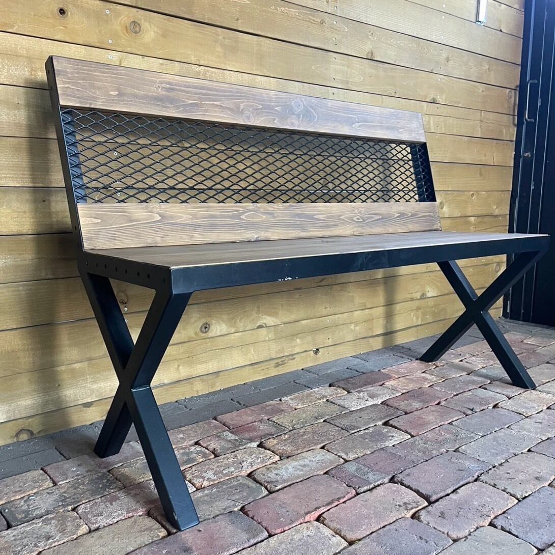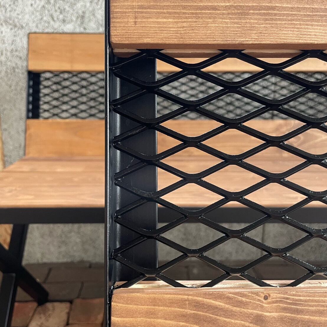 鉄と木の異素材を組み合わせた、無骨で味わい深いガーデンベンチ。背もたれにはアイアンメッシュを使用し、通気性とデザイン性を両立。屋外にも室内にも馴染む、インダストリアルな存在感が魅力です。